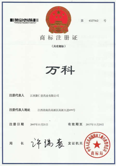 近日,聚仁堂集团旗下江西聚仁堂药业有限公司申请的“万科”共有商标,历时8年终于获得了国家工商行政管理总局的商标注册证,该商标核定使用服务项目为第5类:兽医用药、兽医用制剂、中药成药、人用药、针剂、原料药、医药制剂、化学药物制剂、医用药物、医用酒精。该商标同时与江西优奇科技有限公司(原江西省百思特动物药业有限公司)共同拥有。