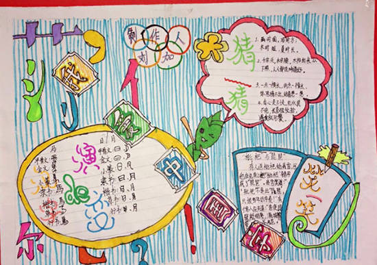 语文教材第五组《综合性学习:遨游汉字王国》是引导学生进行综合性学习,初步了解汉字的特点和发展历史,加深学生对汉字和中华传统文化的感情,提高正确运用汉字的自觉性。同时培养学生策划和开展活动、查找和运用资料的能力。比赛前语文老师组织学生学习了有关课文,让学生收集“有趣的汉字”各方面的知识,并通过自己灵巧的双手,精心设计版面,创作出了一幅幅色彩艳丽、构思独特、内容丰富的手抄报。本次手抄报内容涉及有趣的字谜、仓颉造字、一点值千金、谐音歇后语、谐音笑话、字的来历等方面的知识,收到了很好的教育效果。