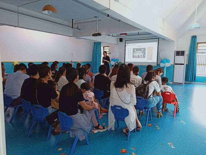 首先,纪园长向各位家长介绍了聚仁堂集团旗下的幼儿园概况,以及我们所在园所的基本情况、师资配备、园所环境(室外硬件、室内环境)、办园特色等。还重点针对“如何帮助幼儿度过入园焦虑期”进行讲解,介绍了孩子入园会出现的一些生理、心理方面的变化,为家长提供了建议和配合要点,并就幼儿在园的一日生活安排、教育教学工作、安全工作、家园共同配合工作、重大活动安排等方面的工作向家长进行了详细的介绍。通过精彩讲述让新生家长们了解了新生入园的一些基本情况。