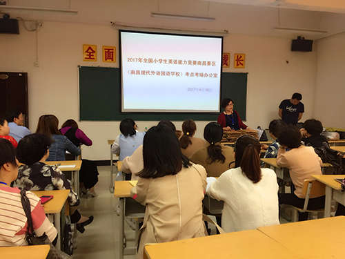 4月16日,2017年全国小学生英语能力竞赛(NECPS)初赛在南昌现代外国语学校(象湖校区)举行,作为本次竞赛的考点之一,我校高度重视此项工作,从监考教师的配备再到横幅及考场指示牌、考点分布图的温馨提示,我校都做好了充分的准备。考前,学校组织全体考务人员进行了培训。在各部门的通力配合下,各考场布置严肃规范,考场秩序井然,很好地完成了考场布置等工作。