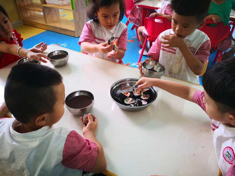 寿司是在饭里放醋做成卷的日本料理,它和其他日本料理一样,色彩非常鲜明。寿司中的大米虽然各种营养素含量不是很高,但因人们食用量大,故其也具有很高营养功效,是补充营养素的基础食物;米粥具有补脾、和胃、清肺功效。今天我们的厨师和生活老师为小孩子准备了既丰富又营养的午点——寿司。