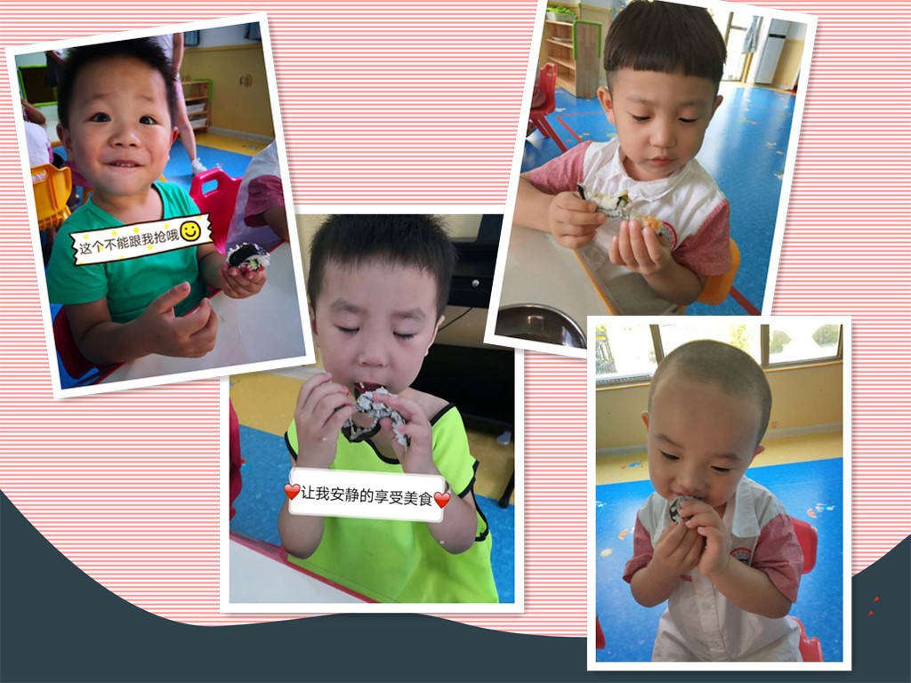生活老师将寿司分到各个班级,当进教室时小朋友们两眼放光看着老师手上拿的寿司,吵着“我要吃,我要吃……”小朋友都迫不及待地想吃啦……