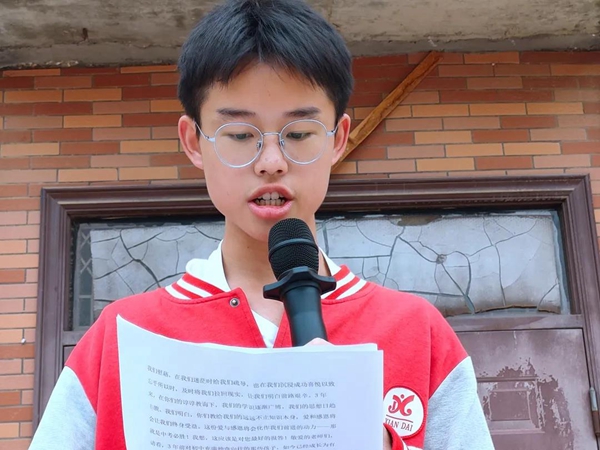 龚凯作为初三毕业生代表上台道出了他经历了初一的纯真年代,走过初二的轻舞飞扬,迎来初三的紧张忙碌,到现在依依惜别的种种感慨,表示会牢记母校的谆谆教导,升入高中后会努力学习,以优异的成绩回报母校,感恩老师辛勤付出!最后,他决定带着“乐善好学 健康卓越”校训走上更高的舞台,插上梦想的翅膀,展翅高飞!