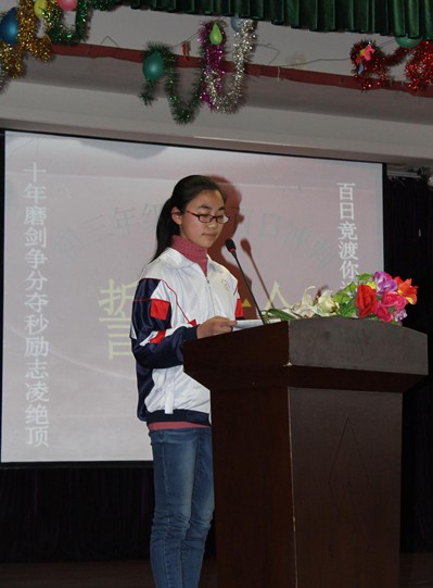 当天下午2时整,誓师大会正式开始,全体起立,奏唱国歌。伴随着嘹亮的国歌声响彻云霄,全体师生精神饱满,爱国之情油然而生。随后,学校校长李金玉发表了热情洋溢的讲话,她鼓励初三年级全体师生再接再厉,不负学校厚望,对最后100天的教学提出了具体要求和指导性意见。紧接着,老师代表上台发言。老师的殷切希望,谆谆教诲又有一次鼓舞了在座的全体学子。接下来,学生代表上台发言。学生代表表示,在最后的100天里,决心集中全部精力打好基础,科学合理分配时间,不断调整自己的学习方法,以百倍的信心战胜一切困难,勇夺2014年中考佳绩,回报父母的养育之恩,回报恩师的教导之情,将来成为对国家有用之才。同时,会议特别安排了家长代表发言。家长代表朴实的话语充满着对学校、孩子们的殷切希望,既有鼓励,更饱含着期待。