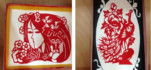 这两幅是中二班李春红老师用刀刻出来的美丽孔雀锦花图和淡妆少女图。