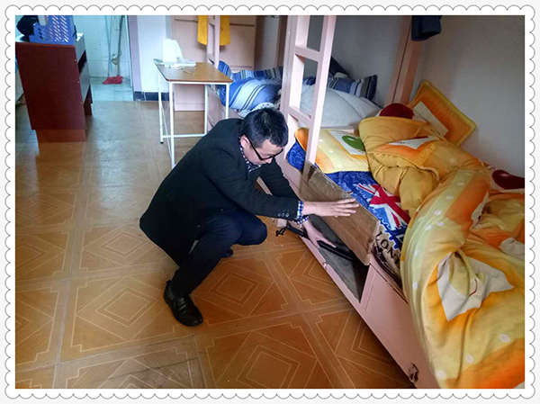 检查中,检查组成员与生活老师对学生宿舍每个角落进行认真仔细的查看,包括箱、柜、床等角落,任何有可能藏匿管制刀具、易燃易爆物品地方都不放过。