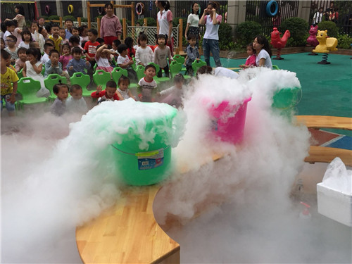 本次活动的主题是《干冰的奥秘》和《神奇的烟雾大炮》。活动开始通过一个小游戏来阐述二氧化碳的制作物——干冰的神奇效果。老师先往三个透明瓶子里装满了绿,篮,橙三种颜色的色素水,随后加入了一些干冰,水马上冒起了白烟。为了让孩子们感受大气压力,老师分别用“大头吹风机”和“神奇的烟雾炮弹”等游戏,让孩子感知气压以及气压与体积的关系。