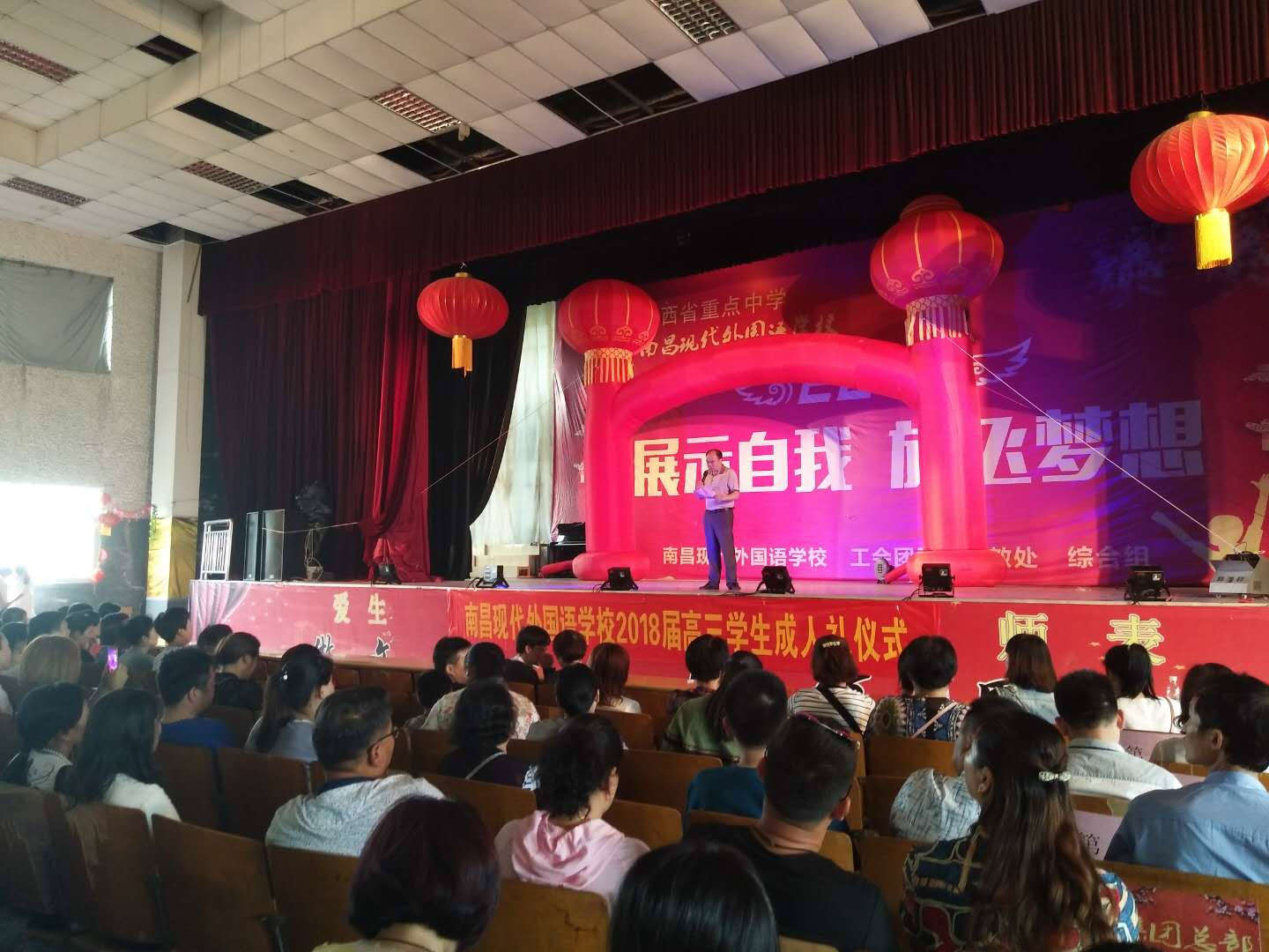 以“青春勇担重任,责任成就梦想”为主题的南昌现代外国语学校2018届成人礼活动,5月14日下午2:30在学校演播大厅隆重举行。高三全体师生及家长齐聚学校演播大厅,迎接这神圣的一刻。学校杨端煌校长、小学部涂玉萍校长、高中部王文群主任、高三年级组