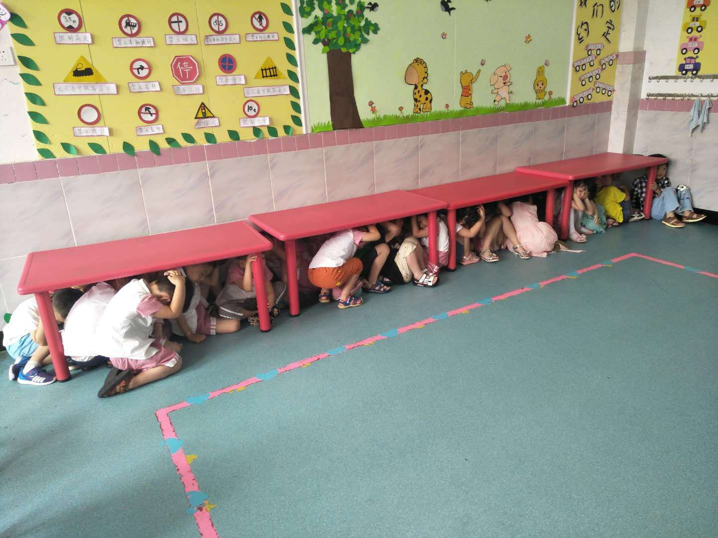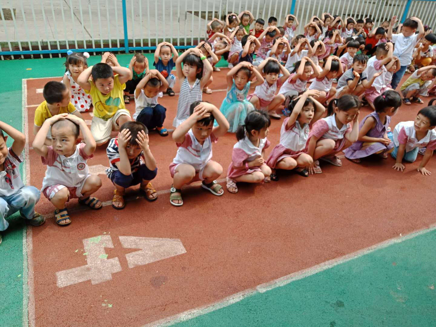 一分钟后,信号员解除警报,各班教师组织幼儿用手或其他物品保护头部,迅速有序地分别从各个安全通道紧急疏散到室外安全空旷的场地(一楼操场)。