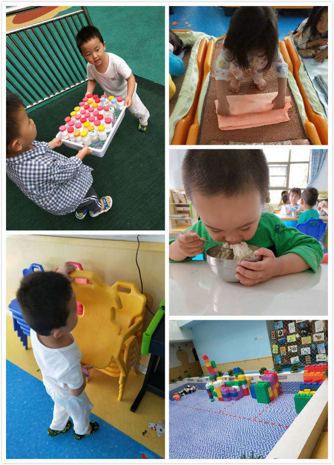 比如教会孩子叠被子,虽然开始的时候动作很生疏,但要放手让他做,通过教师的指点与协助并及时的表扬与鼓励,孩子们都能够独立完成任务。入园的三个月以来,不管是宝宝班的宝贝们还是小班的宝贝们,都可以做到自己的东西自己整理,自己的食物自己消灭,自己的椅子自己放回原位,玩好的玩具收拾起来,别人需要帮助时都会伸出援助之手。园内有一处大区角,但不管是哪个班级的幼儿来到建构积木池大区角玩,到后面你都可以看到一排排摆放的整整齐齐的大型积木出现在泳池里。教师们都是在生活中的一些小细节中培养幼儿的自我锻炼能力和自我服务意识。