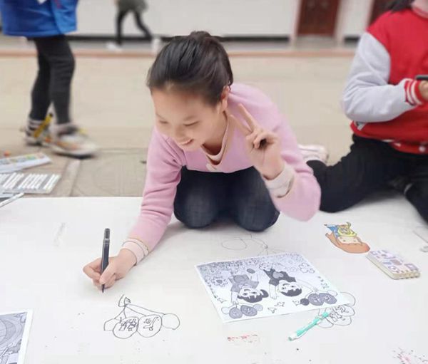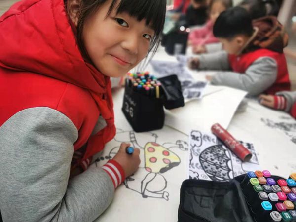 经过近1个小时的集体创作,雪白的百米长卷已经变成绚丽多姿的美丽画卷,一幅幅栩栩如生的画面跃然于画布上。孩子们充分发挥自己的想象力,以线条和色彩充分地表达出对对学校、对新年和对艺术的热爱之情,在七彩流光的韵律中,一张张绚丽的画面,呈现出精彩瞬间。